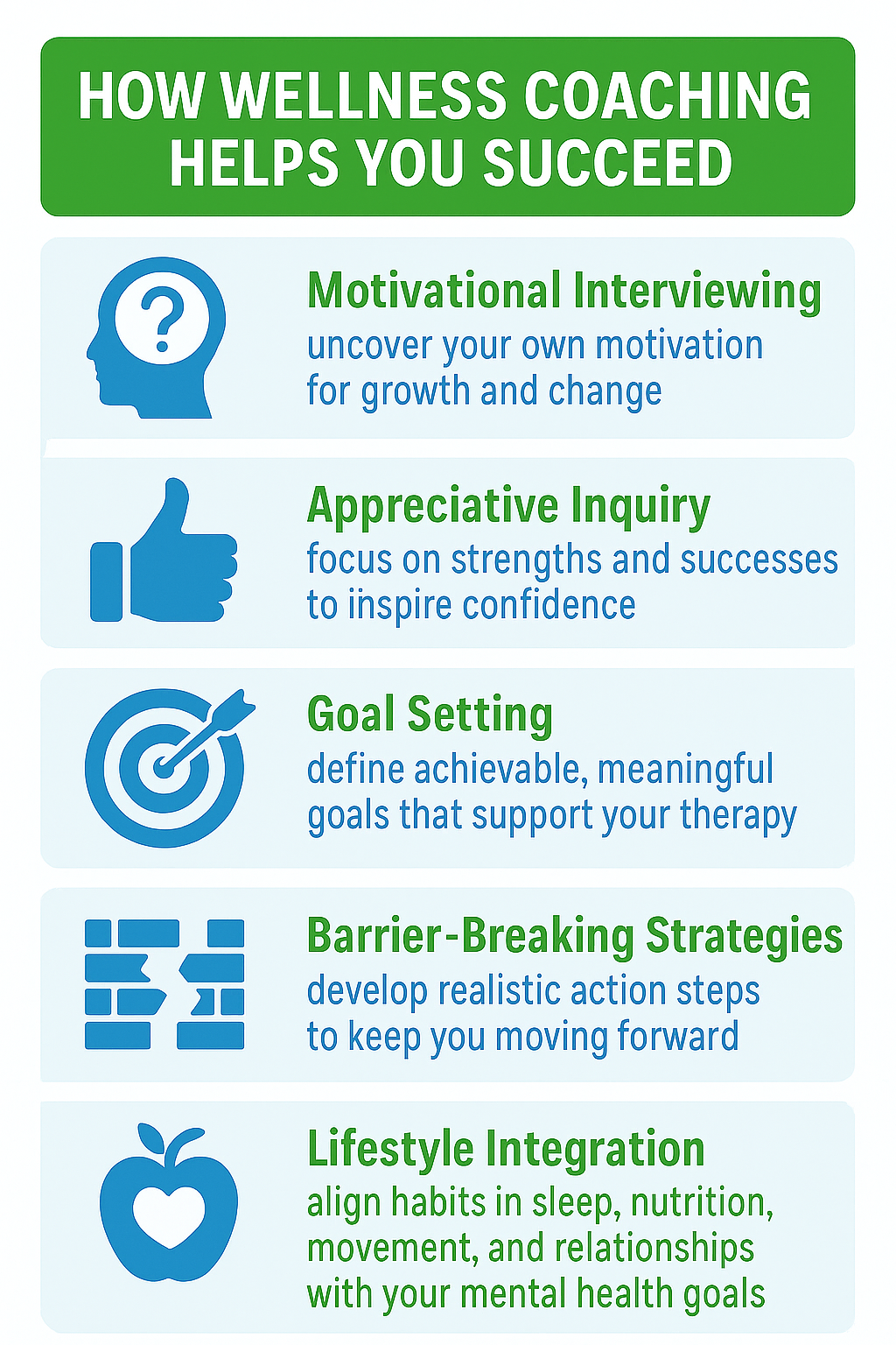 Wellness coaching significantly improves goal attainment and mental health outcomes. Grant, A. M. (2003).